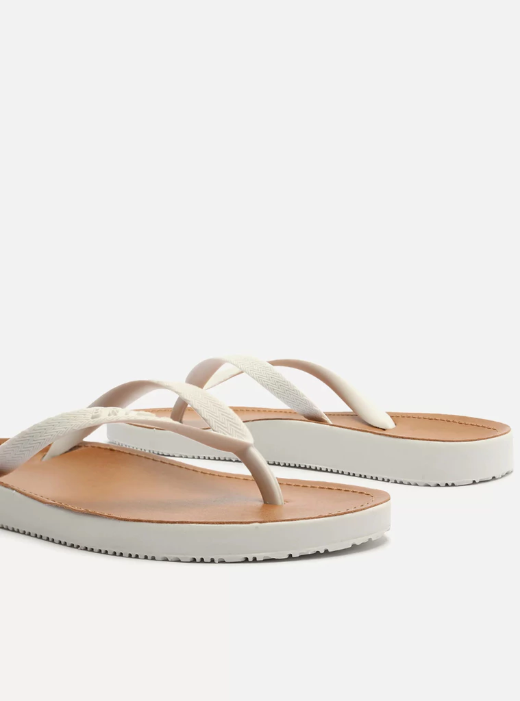 Chinelo de dedo branco. O modelo tem sola rasteira flat injetada de PVC e palmilha lisa marrom. De bico redondo, traz tiras finas injetadas, dividindo os dedos, e com inscrição do nome da marca em uma delas. Aberto, o chinelo de dedo exibe todo o pé.
